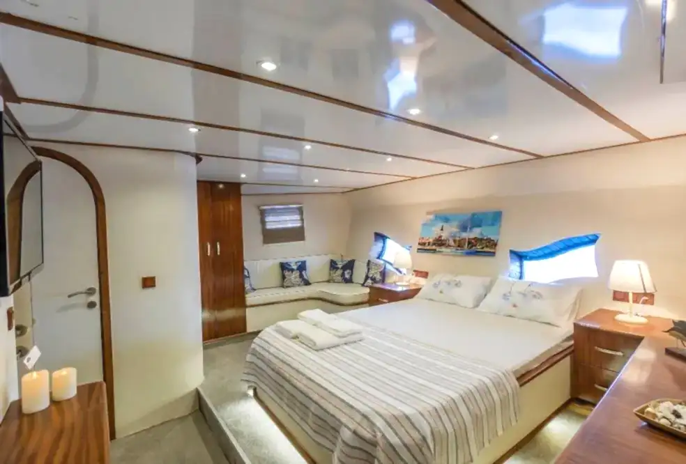 Mavi tur teknemiz 1998 yapımı ve 2019 yılında yenilenmiştir. 24 metre uzunluğunda ve 6.8 metre eninde olup 2 double ve 2 master kabinle 8 misafirimize hizmet vermektedir. Her kabinde tuvalet ve özel banyo bulunmaktadır. Kapasiteye bebekler ve çocuklar da dahildir.